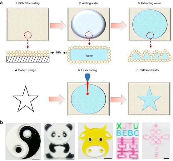 “抽刀斷水水更流”!針對水如何能實現(xiàn)切割這一難題,西安交通大學(xué)生命科學(xué)與技術(shù)學(xué)院仿生工程與生物力學(xué)研究所合作提出“激光切水”的新技術(shù)。首先,用疏水性的SiO2納米顆粒包覆在水的表面構(gòu)建了厚度為亞毫米級的水餅,隨后用激光對該水餅實施切割,成功實現(xiàn)了“激光切水”的構(gòu)想,并制造出了多種“水圖案”。