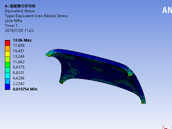 可以通過最后的結(jié)果圖發(fā)現(xiàn),底座的最大位移出現(xiàn)在底座的中心處,位移量為1.86mm,數(shù)值上是比較小的;最大應(yīng)力值出現(xiàn)在底座的四個(gè)支撐點(diǎn)上,最大應(yīng)力值為19.86MPa,而工程abs塑料的許用應(yīng)力值為24.5MPa.可以看出即使在3000Pa的壓力作用在整個(gè)面下,底座仍然能承受.那么在通常在手寫板上寫字的時(shí)候,底座仍然能承受住壓力,不會(huì)產(chǎn)生較大變形.但是有一點(diǎn)需要注意:由于底座是靠4個(gè)支點(diǎn)支撐,所以底座上不能放置太重的物體,以免支點(diǎn)上的應(yīng)力大于abs的許用應(yīng)力,致使底座變形.