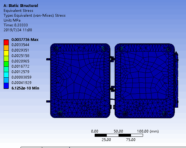 對(duì)于折疊式手寫板所材料屬性也都大同小異,所加載荷為底板固定,上面給一個(gè)壓力載荷.從結(jié)果可見手寫板完全承受在正常使用情況下所受的力.