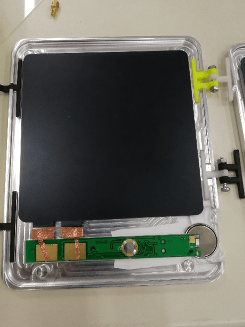 第二大困難是電路板的連接問題.由于我們需要把電路板和電池舒適地放置在槽中,我們把電路板進(jìn)行了稍微的改造,用導(dǎo)電帶實(shí)現(xiàn)正負(fù)極連接,使電池得以平放.然而由于電路板與液晶膜極其敏感脆弱,研究如何連接才能使其正常工作花了我們較長時(shí)間,甚至燒壞了不止一塊電路板.